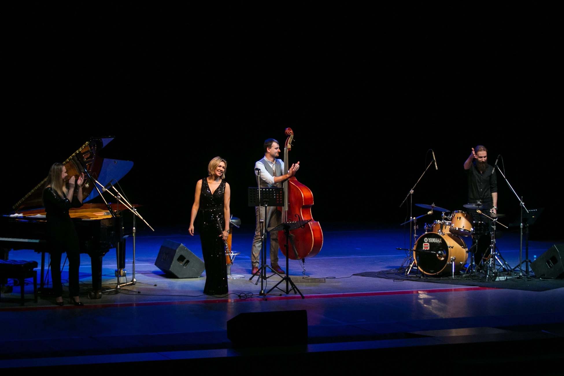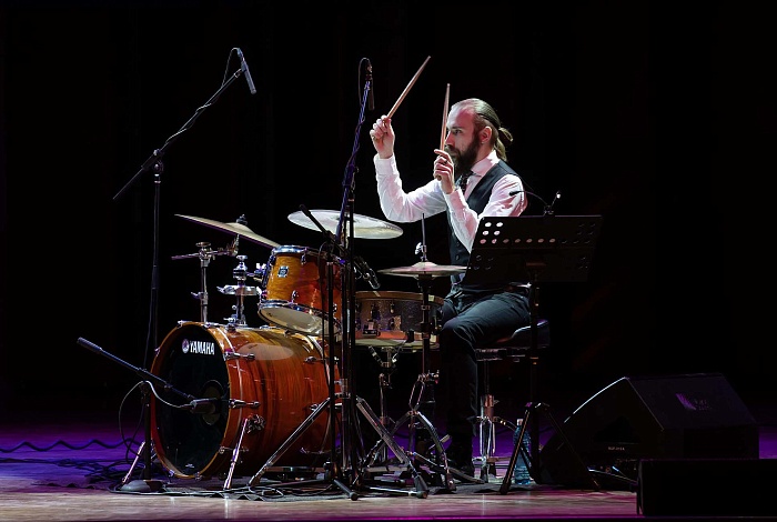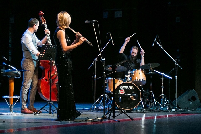 Квартет виртуозов — фортепиано, флейта, контрабас и ударные — в сопровождении симфонического оркестра